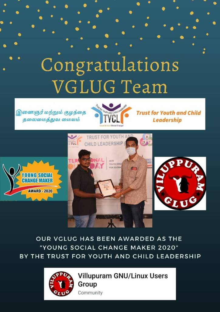 அன்பிற்குரிய நண்பர்களே, நமது VGLUG (vglug.org) அமைப்பின் பணிகளை பாராட்டி இளைஞர் மற்றும் குழந்தைகள் தலைத்துவ மையம் (TYCL) சார்பாக இந்த ஆண்டிற்கான இளம் சமூக மாற்றத்திற்கான (Young Social Change Maker 2020) விருது அளிக்கப்பட்டது. நமது VGLUG அமைப்பின் சார்பாக ஒருங்கிணைப்பாளர் திரு.சதீஷ்குமார் அவர்கள் விருதினையும்,