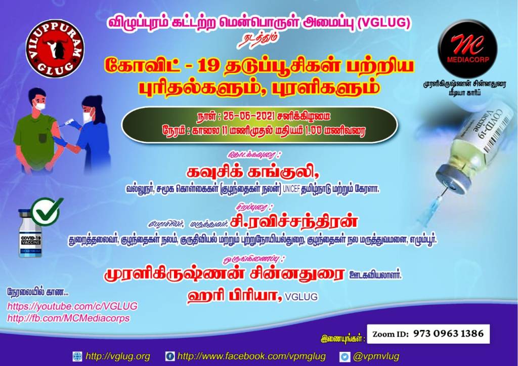 இன்று சிறு வயதினர் முதல் பெரியவர்கள் வரை மிகவும் அறிந்த வார்த்தையாகவே கொரோனா பெருந்தொற்று உள்ளது. அதே போன்று அதற்கான அறிகுறிகள், முன்னெச்சரிக்கை நடவடிக்கைகள் பற்றி ஓரளவு மக்கள் அறிந்த வண்ணம் உள்ளனர். ஆனால் இதற்கான தடுப்பூசி பற்றி மக்கள் மத்தியில் மிக தவறான போலி செய்திகளே இன்றளவும் பரவி உள்ளது. பலர் தடுப்பூசி போடாமல் இருப்பதற்கு இதை பற்றிய தவறான செய்திகளும், கட்டுக்கதைகளுமே முக்கிய காரணம். வரும் சனிக்கிழமை (26.06.2021) கொரோனா தடுப்பூசி பற்றி உங்களின் பல சந்தேகங்களை நேரடியாக மருத்துவர் முன்பே நீங்கள் கேட்டு அறிய விழுப்புரம் கட்டற்ற மென்பொருள் அமைப்பு ஏற்பாடு செய்துள்ளோம். இந்த வெபினாரில் கலந்துகொண்டு நம் எல்லோரின் சந்தேகங்களுக்கு தீர்வு காணுவோம்! தடுப்பூசி போடுவோம்!