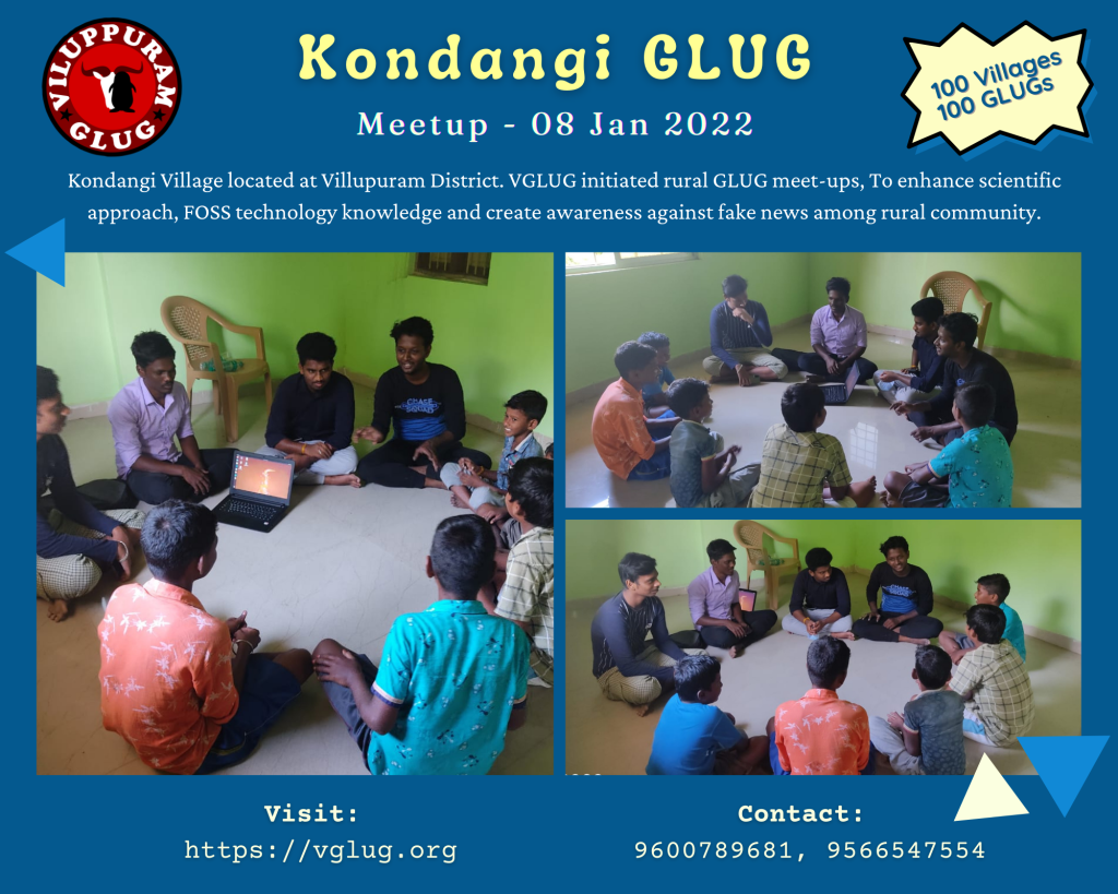 விழுப்புரம் கட்டற்ற மென்பொருள் அமைப்புடன் (VGLUG) ஒருங்கிணைந்த கொண்டங்கி GLUG-இல் ஜனவரி 8, 2022 சனி கிழமையில் வாராந்திர கூட்டம் நடந்தது. இதில் சுமார் 8+ மாணவர்கள் கலந்து கொண்டனர்.