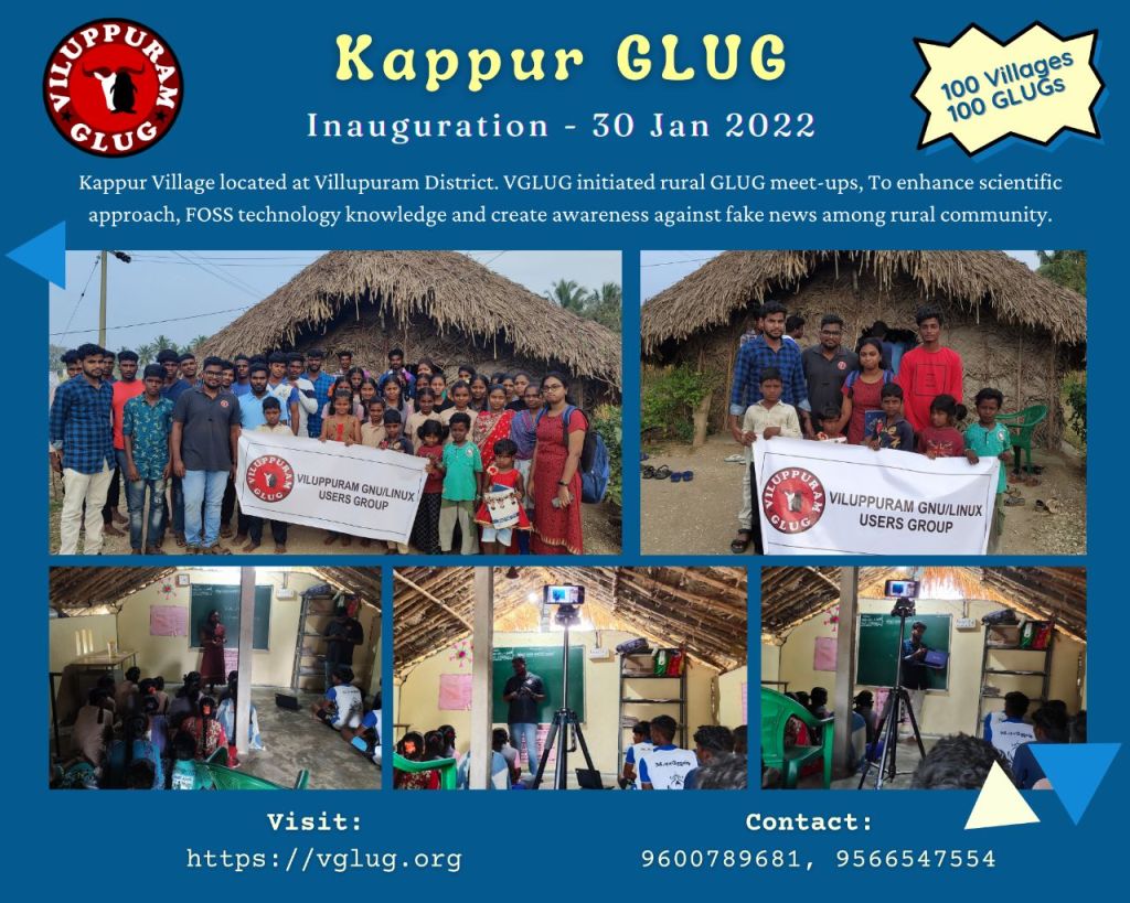 சமீப காலமாக பல போலி செய்திகள், வதந்திகள் சமூக ஊடகங்களில் உலவி வருகின்றன. இது சமூகத்தில் தேவையற்ற தவறான புரிதலை மற்றும் குழப்பத்தை ஏற்படுத்துகிறது. இத்தகைய போலி மற்றும் தவறான இணைய செய்திகள் பற்றிய விழிப்புணர்வை கிராமபுற மக்களிடையே ஏற்படுத்தும் நோக்கில் VGLUG பல கிராமங்களில் விழிப்புணர்வு பயிற்சி முகாம்களை நடத்தியும், பல தொழில்நுட்பத்தை பகிர்ந்தும் வருகிறது. அதன் தொடர்ச்சியில் ஐந்தாவதாக கப்பூர் கிராமத்திலும் 100 Villages 100 GLUGs என்ற முன்னெடுப்பில் புதிய GLUG கிளையை VGLUG அமைப்பு இந்த வாரம்(30-Jan-2022) அன்று தொடங்கியது.