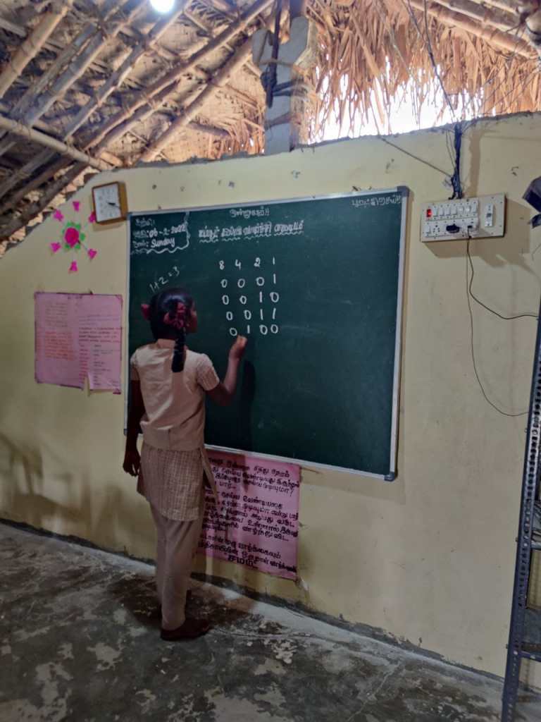 கணினியின் பரிணாமம் பற்றி இன்றைய வகுப்பு ஆரம்பிக்க பட்டது. சதிஷ், கணினியின் தேவைகள் மற்றும் அதன் வரலாறு பற்றிய தொகுப்பை வழங்கினார் . மேலும், கணினி புரிந்து கொள்ளும் மொழியான Binary Numbers பற்றி எளிதாக மாணவிகள் புரிந்துகொள்ளும் வகையில் விளையாட்டு கணக்காக கரும்பலகையில் ஒவ்வொருவராக வந்து விடை எழுத சொன்னார். மாணவிகள் மிகவும் உற்சாகத்துடன் விடைகளை எழுதினார், விரைவாக புரிந்து கொண்டனர். சிவசக்தி, கணினியின் பாகங்களும் அதன் செயற்பாடுகளும் பற்றிய தொகுப்பை விளக்க படங்களுடன் கற்று கொடுத்தார்.