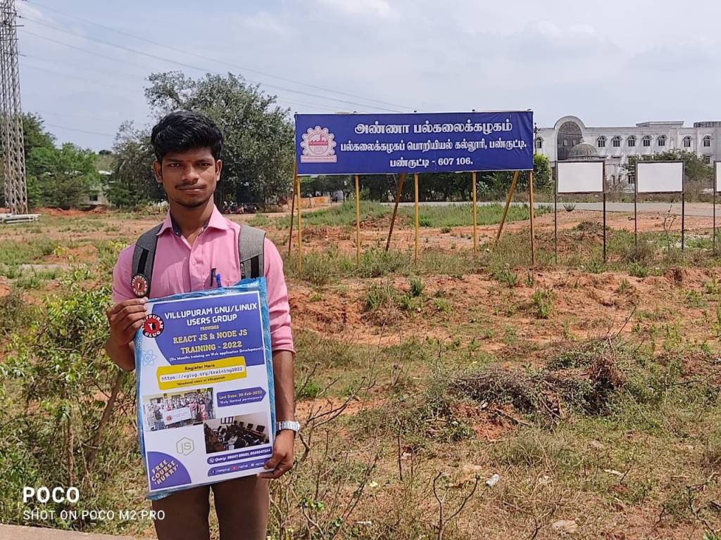 மேலும் அதனை விழுப்புரம் மற்றும் அதனை சுற்றியுள்ள கல்லூரிகளுக்கு தெரியப்படுத்தும் நோக்கில் நமது VGLUG தன்னார்வலர்கள் நேரடியாக கல்லூரிகளுக்கு சென்று நமது போஸ்டர் அட்டைகளை கல்லூரி முதல்வர்களிடமும், HOD-களிடமும் பகிர்ந்துகொண்டு இப்பயிற்சி பற்றி விவரித்துக் கூறினார். மேலும் மாணவர்களுக்கு இதனைப் பற்றி தெரியப்படுத்தவும் கேட்டுக்கொண்டனர். இது பிரதாப், விக்னேஷ், நரசிம்மன், திலீப் மற்றும் வெங்கடேசன் இவர்களால் சாத்தியமானது மற்றும் நமது நட்பு வட்டங்கள் மூலமும் தெரிந்த கல்லூரிகளுக்கு தகவல் தெரிவிக்கப்பட்டது.
