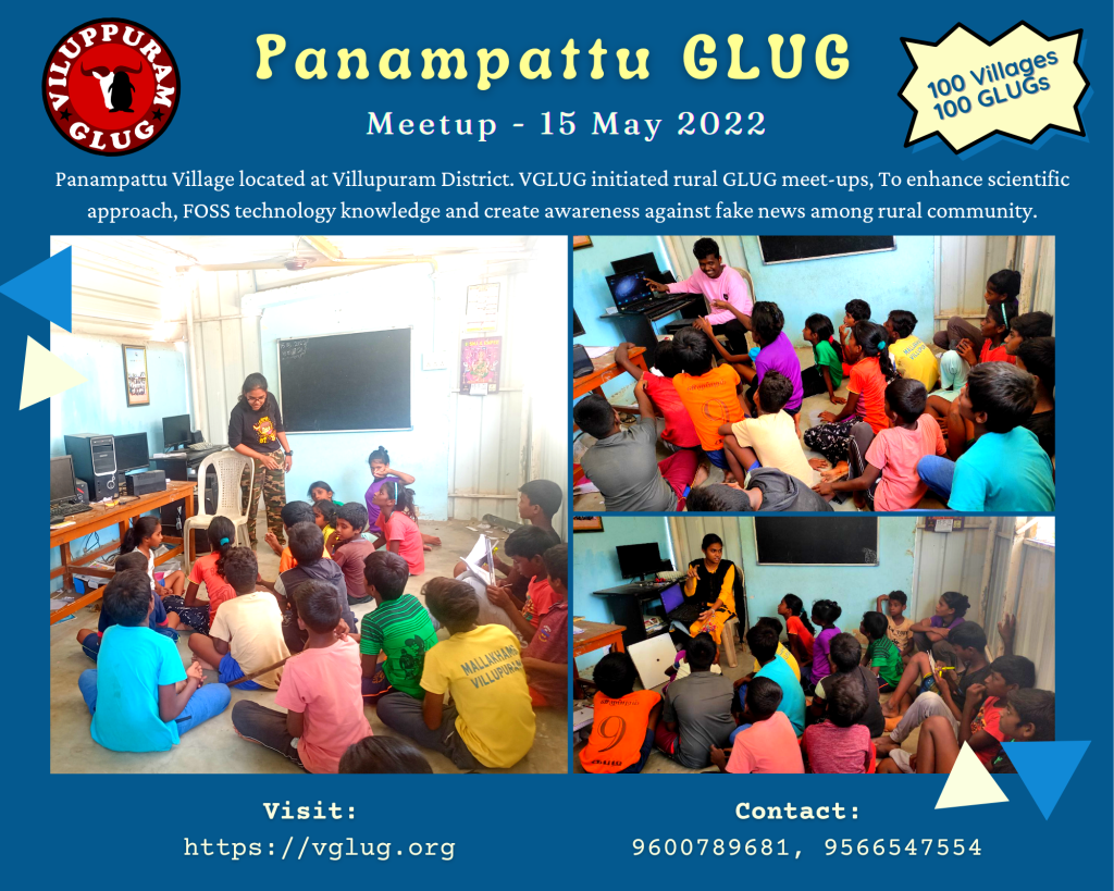 விழுப்புரம் கட்டற்ற மென்பொருள் அமைப்புடன் (VGLUG) ஒருங்கிணைந்த பானாம்பட்டு GLUG-இல் May 15, 2022 ஞாயிற்றுக்கிழமையில் வாராந்திர வகுப்பு நடைபெற்றது. இதில் சுமார் 15-க்கும் மேற்பட்ட மாணவர்கள் கலந்து கொண்டனர்.