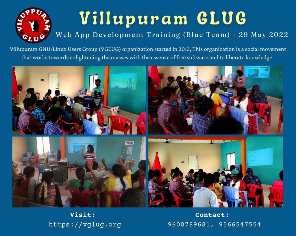 VGLUG sharing various technology knowledge to rural college students. As part of it we are doing Web Development Training class every week. The training is divided into two teams due to huge number of participants. 3rd and final year students are in the Red team and the 1st and 2nd year students are in the Blue team. In this Web Development training we share knowledge about Web Development(ReactJS and NodeJS), Free software technologies, tools and social activities.
