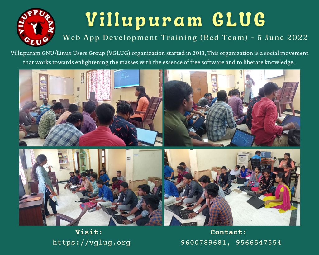 Venue : VGLUG Foundation, Bhavani Street, Alamelupuram, Villupuram – 605 602