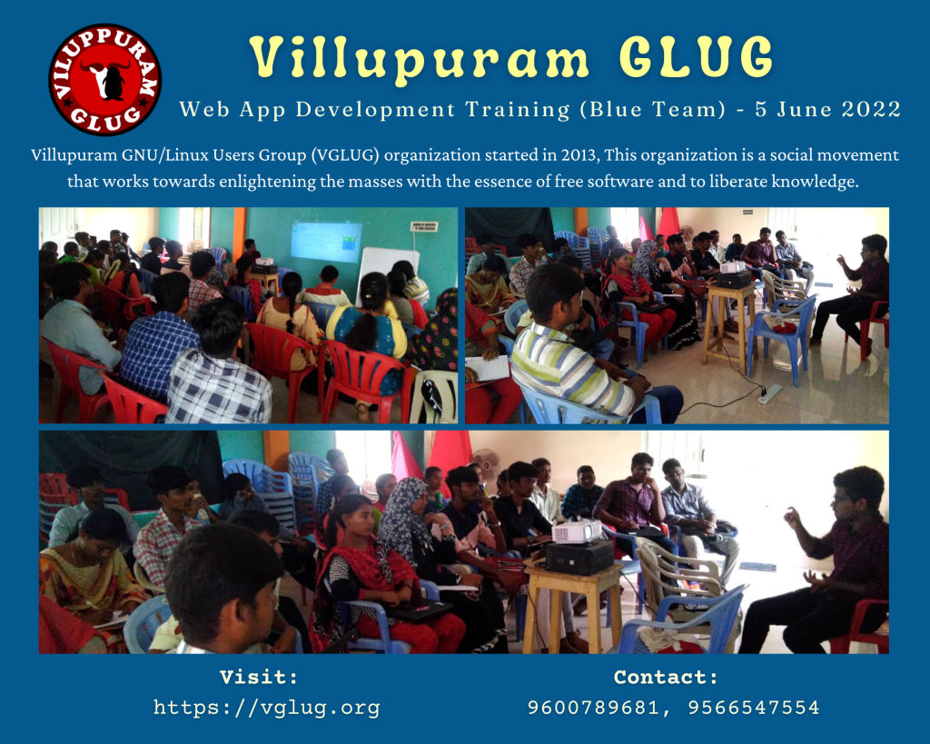 Venue : VGLUG Office, No. 416, Ganapathi nagar, K.K. Road, Villupuram – 605 602