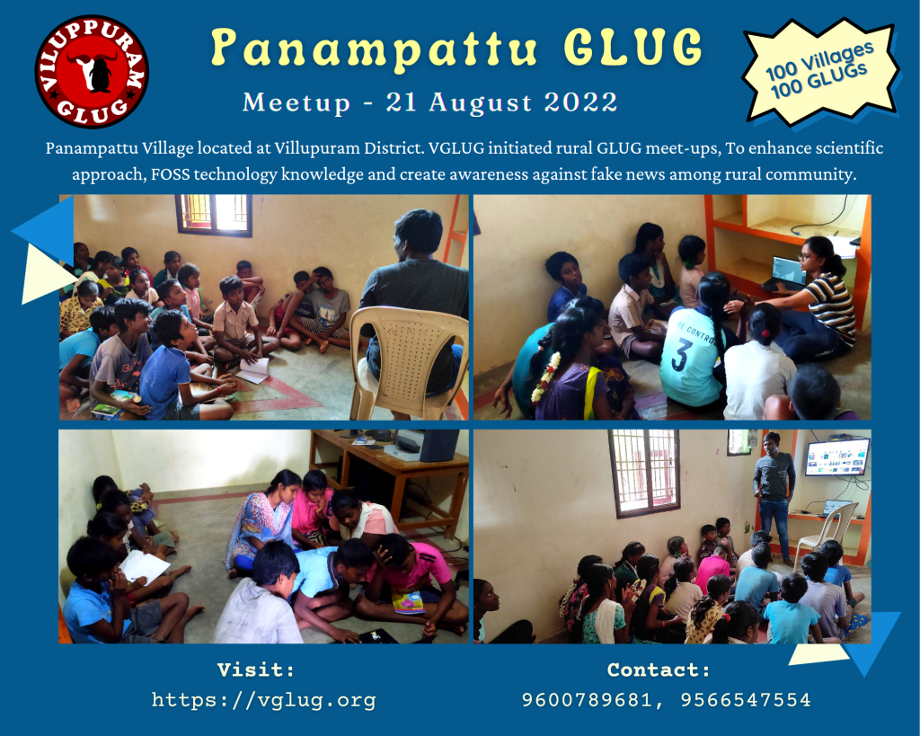 விழுப்புரம் கட்டற்ற மென்பொருள் அமைப்புடன் (VGLUG) ஒருங்கிணைந்த பானாம்பட்டு GLUG-இல் August 21, 2022 ஞாயிற்றுக்கிழமையில் வாராந்திர வகுப்பு நடைபெற்றது. இதில் சுமார் 20-க்கும் மேற்பட்ட மாணவர்கள் கலந்து கொண்டனர்.