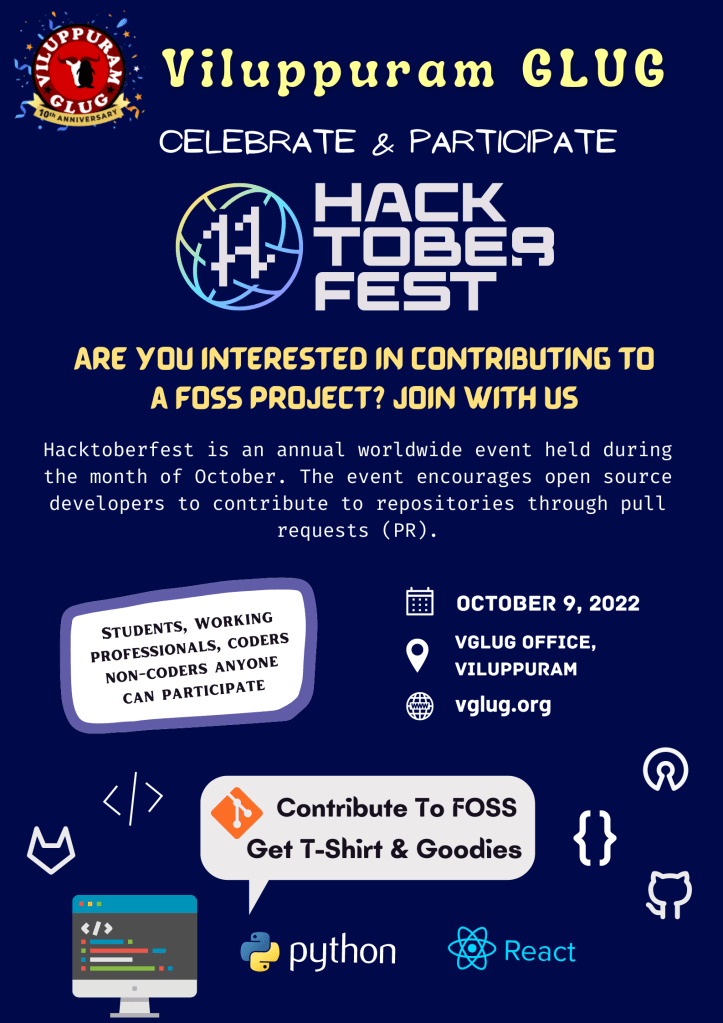 கட்டற்ற மென்பொருள் பற்றியும் அதன் முக்கியத்துவம் குறித்தும், எவ்வாறு பங்களிப்பது என்பது பற்றியும் விளக்கப்படும். மேலும், git, gitlab மற்றும் Hacktoberfest ஆகியவற்றை குறித்த சந்திப்பு நடக்கவுள்ளது. விருப்பமும் ஆர்வமும் உள்ளோர் கலந்து கொள்ளவும்.