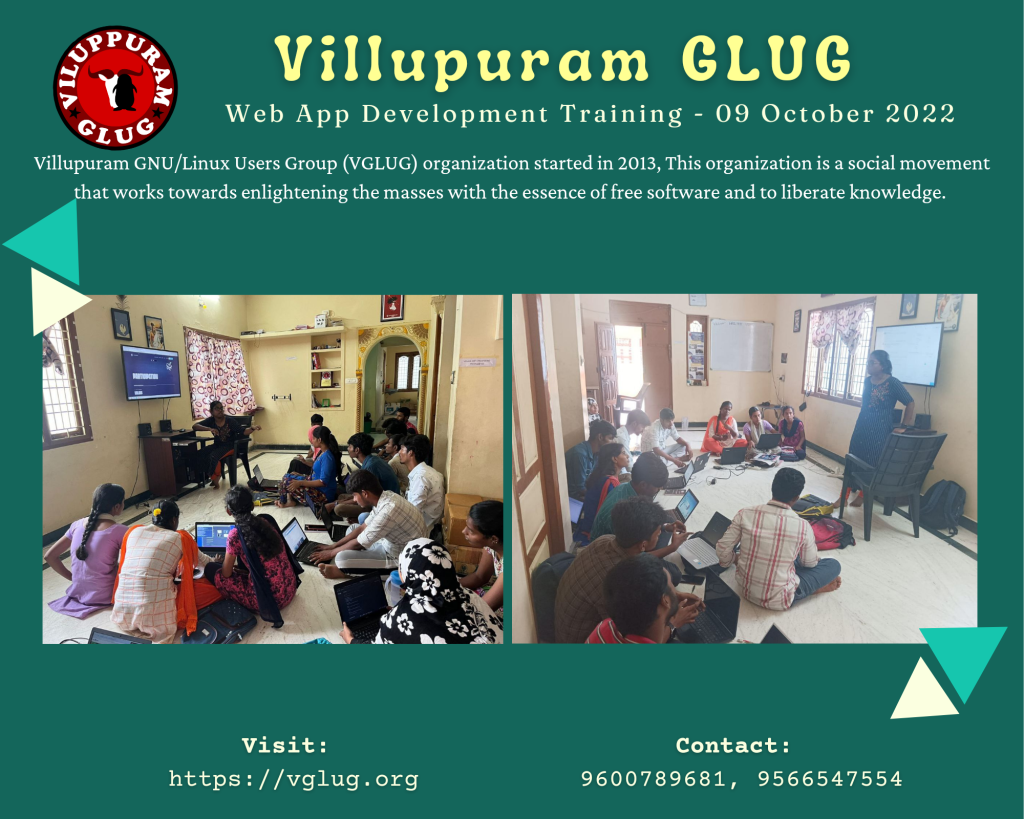 VGLUG sharing various technology knowledge to rural college students. As part of it we are doing Web Development Training class every week. In this Web Development training we share knowledge about Web Development(ReactJS and NodeJS), Free software technologies, tools and social activities.