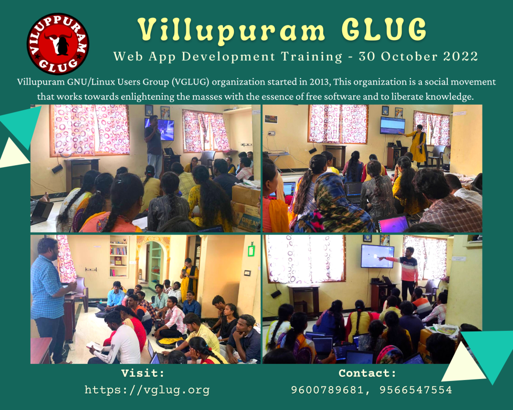VGLUG sharing various technology knowledge to rural college students. As part of it we are doing Web Development Training class every week. In this Web Development training we share knowledge about Web Development(ReactJS and NodeJS), Free software technologies, tools and social activities.