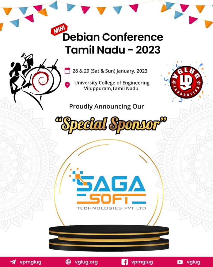 We are excited to announce that “Saga Soft Technologies Pvt Ltd” is our Special Sponsor for the Mini Debian Conference Tamil Nadu 2023. We are grateful for their contribution.