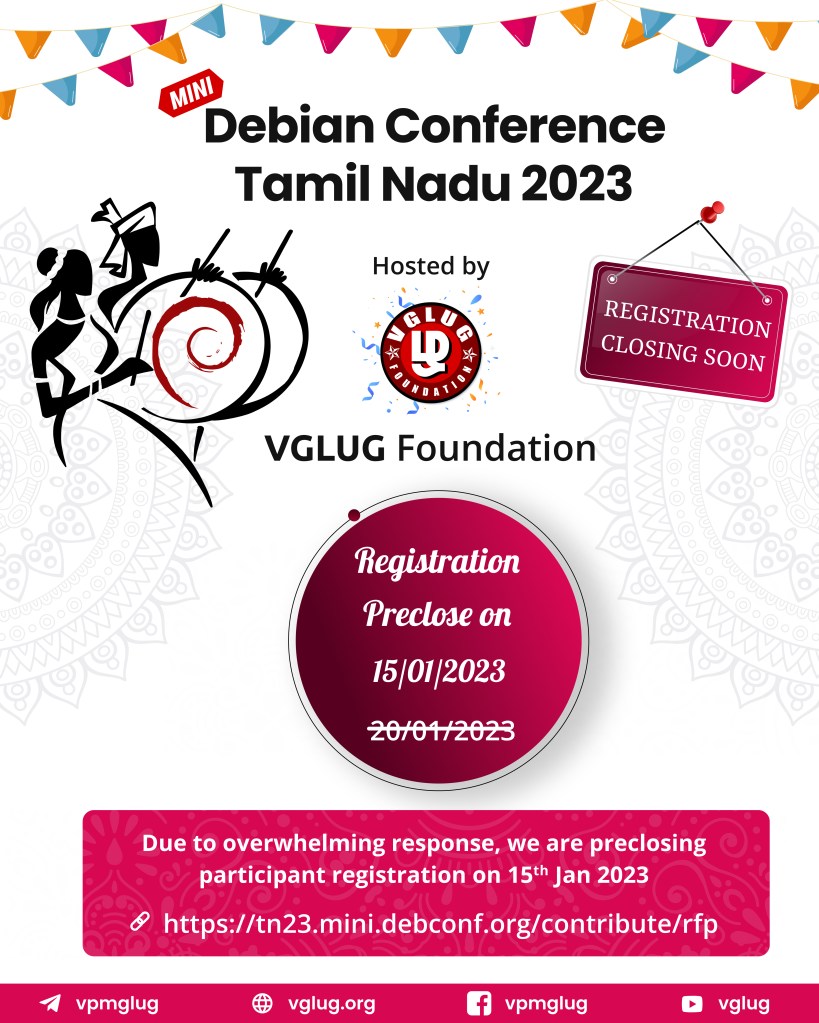 Due to overwhelming responses, we are going to preclose the registration for the Mini Debian Conference Tamil Nadu 2023, hosted by the VGLUG Foundation. Therefore, We have decided to close the registration on January 15th, 2023.