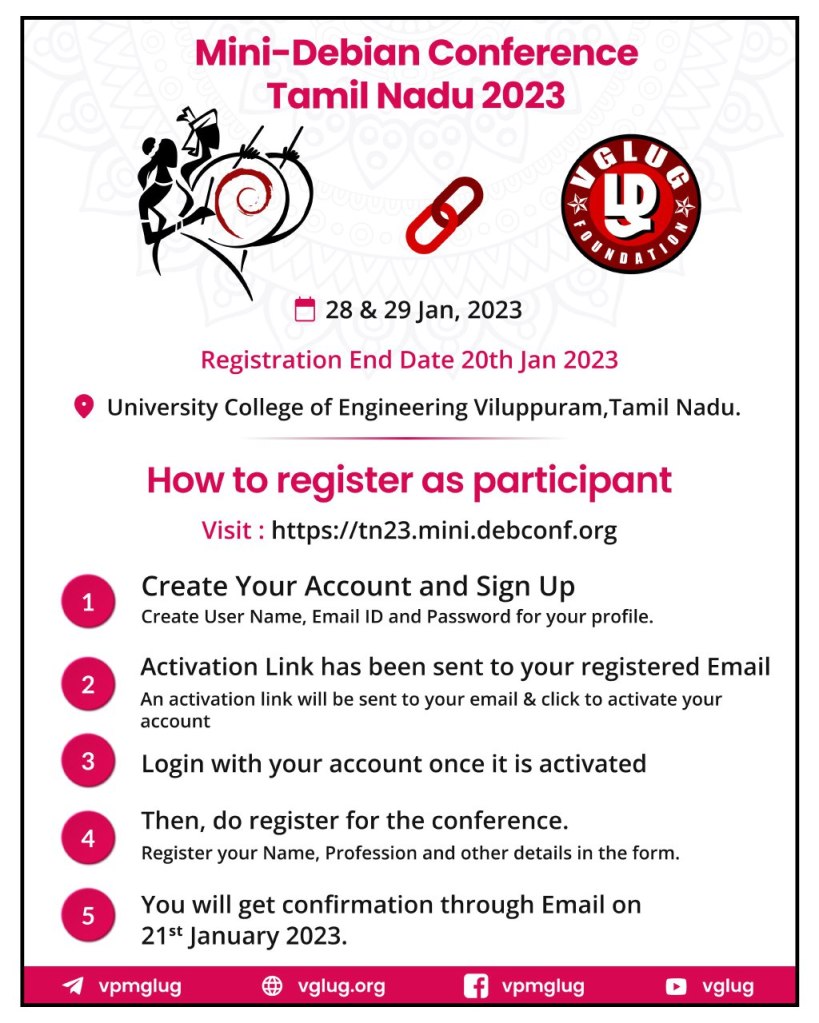 VGLUG அறக்கட்டளை, Debian India அமைப்புடன் இணைந்து நடத்தும் மினி டெபியன் தமிழ்நாடு மாநாட்டில் பங்கேற்க பதிவு(Register) செய்வதற்கான வழிமுறைகள்.