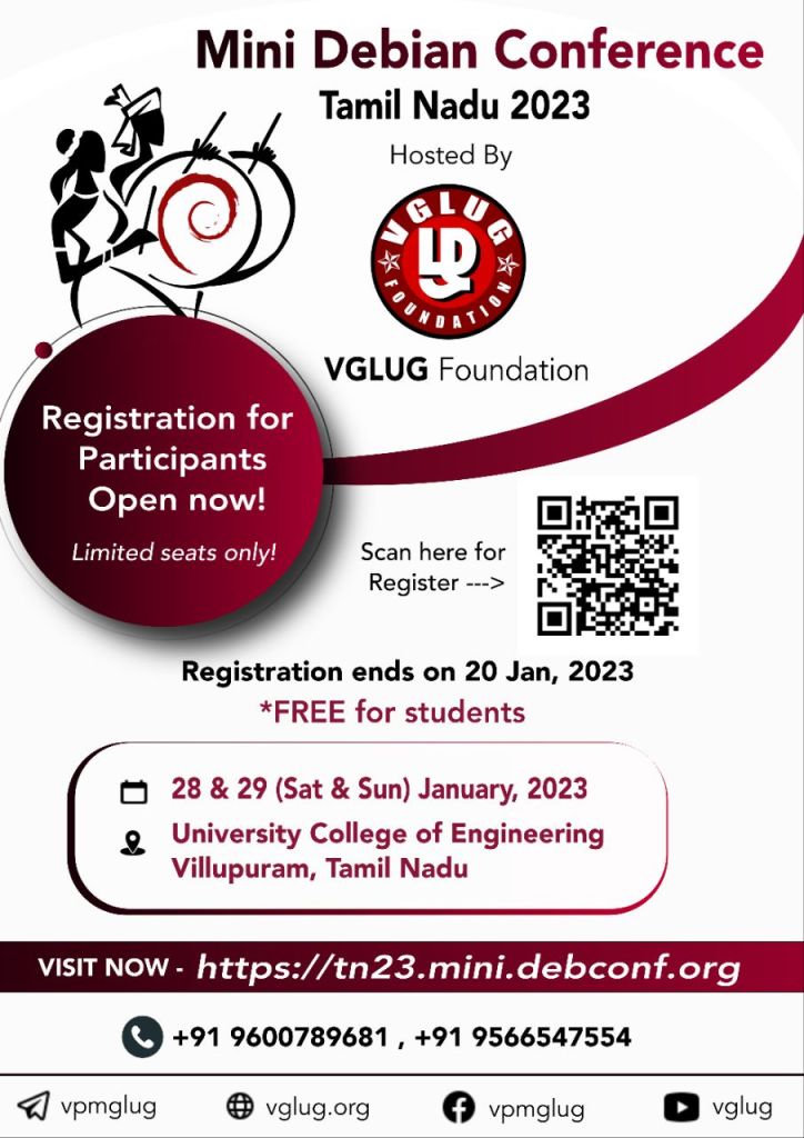 Registration for the Mini Debian Tamil Nadu conference 2023, organized by VGLUG Foundation in association with Debian India, begins today.