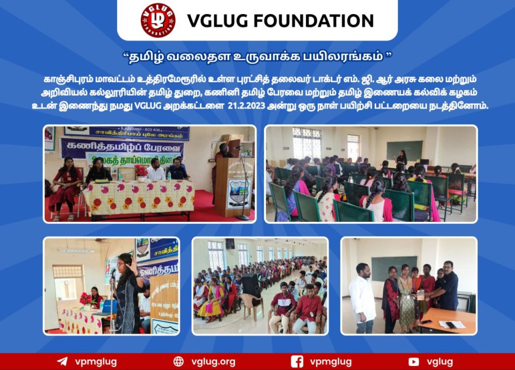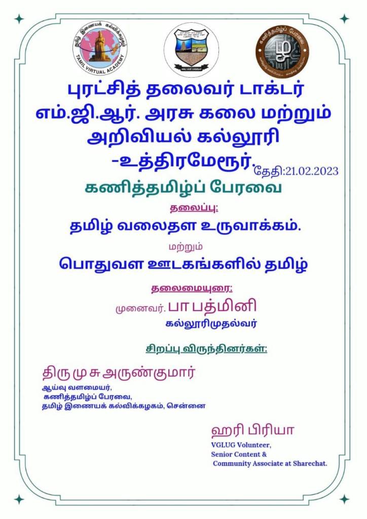 வணக்கம், காஞ்சிபுரம் உத்திரமேரூரில் உள்ள புரட்சி தலைவர் டாக்டர் எம். ஜி. ஆர் அரசு கலை மற்றும் அறிவியல் கல்லூரியில் கணித்தமிழ் பேரவை மற்றும் தமிழ் இணையக் கல்விக் கழகம் உடன் இணைந்து நமது VGLUG அறக்கட்டளை கட்டற்ற மென்பொருள் குறித்து ஒரு பயிலரங்கத்தை நடத்த வாய்ப்பு கிடைத்தது.