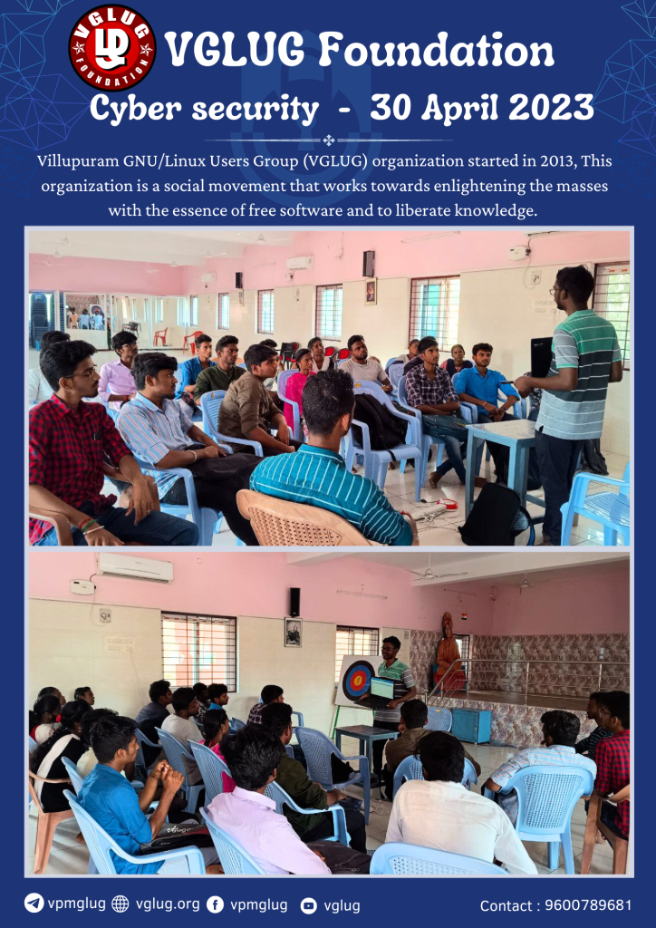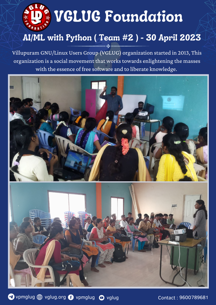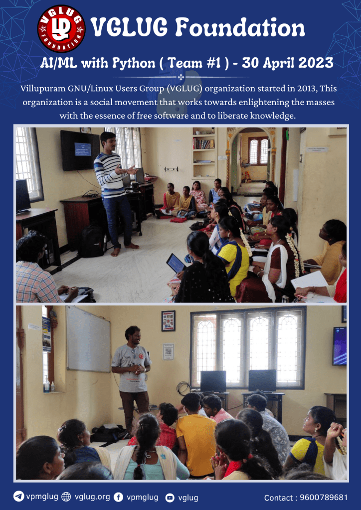 VGLUG sharing various technology knowledge to rural college students. As part of it we are doing AI/ML with Python and Cyber Security Training class every week. The training is divided into three teams due to huge number of participants. Engineering students are in AI/ML with Python Team 1, Arts & Science students are in AI/ML with Python Team 2 and overall cyber security participants are in a separate team. In this training we share knowledge about AI/ML with Python and Cyber Security , Free software technologies, tools and social activities.