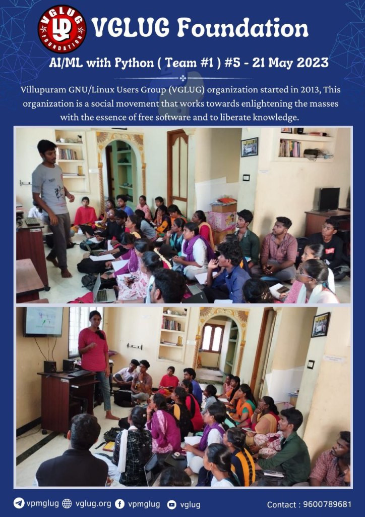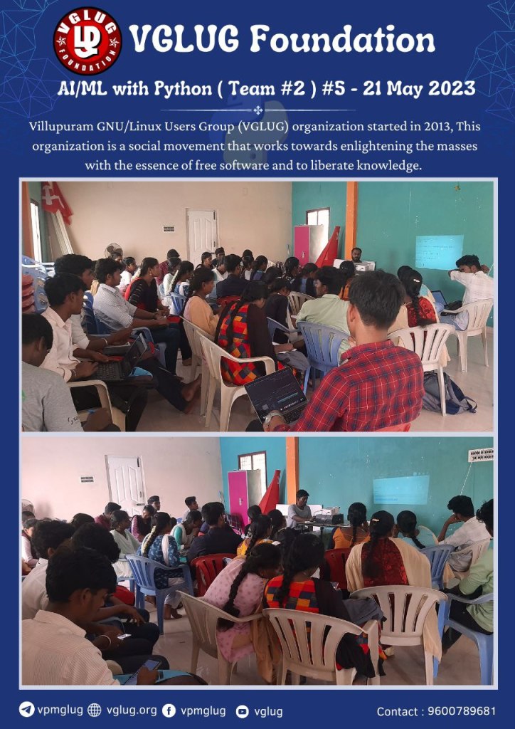 VGLUG sharing various technology knowledge to rural college students. As part of it we are doing AI/ML with Python and Cyber Security Training class every week. The training is divided into three teams due to huge number of participants. Engineering students are in AI/ML with Python Team 1, Arts & Science students are in AI/ML with Python Team 2 and overall cyber security participants are in a separate team. In this training we share knowledge about AI/ML with Python and Cyber Security , Free software technologies, tools and social activities.