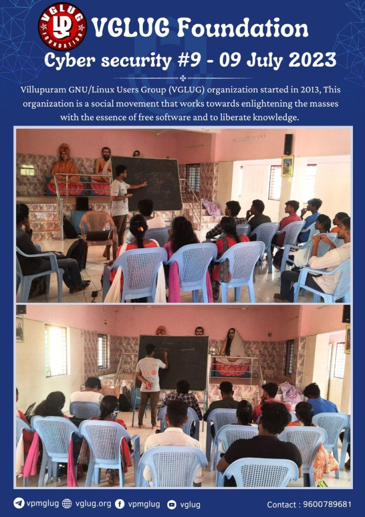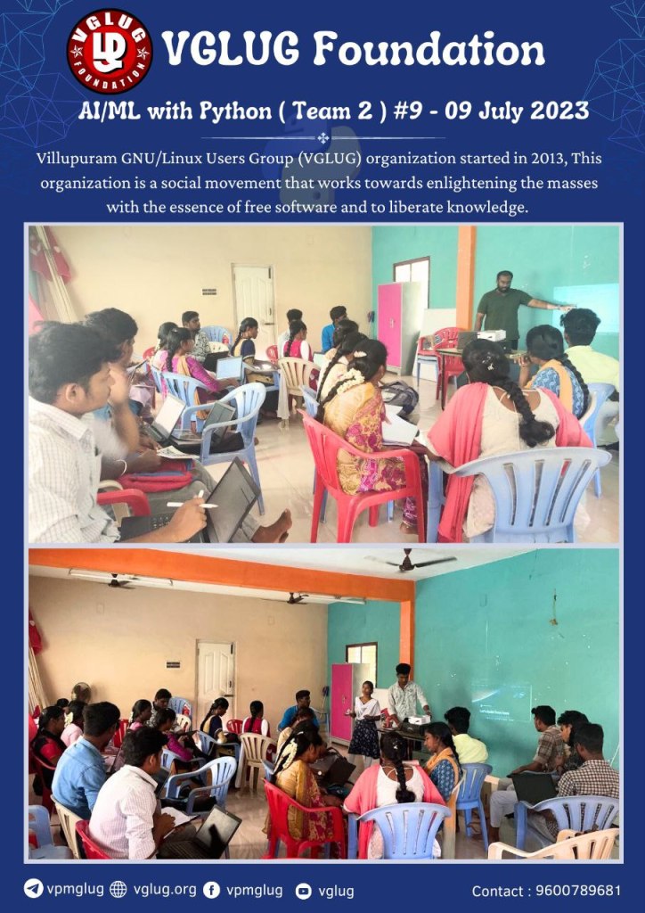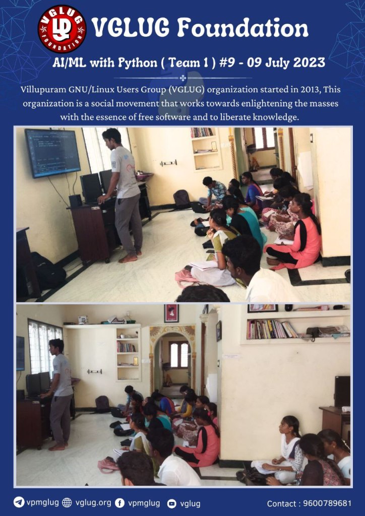 VGLUG sharing various technology knowledge to rural college students. As part of it we are doing AI/ML with Python and Cyber Security Training class every week. The training is divided into three teams due to huge number of participants. Engineering students are in AI/ML with Python Team 1, Arts & Science students are in AI/ML with Python Team 2 and overall cyber security participants are in a separate team. In this training we share knowledge about AI/ML with Python and Cyber Security , Free software technologies, tools and social activities.