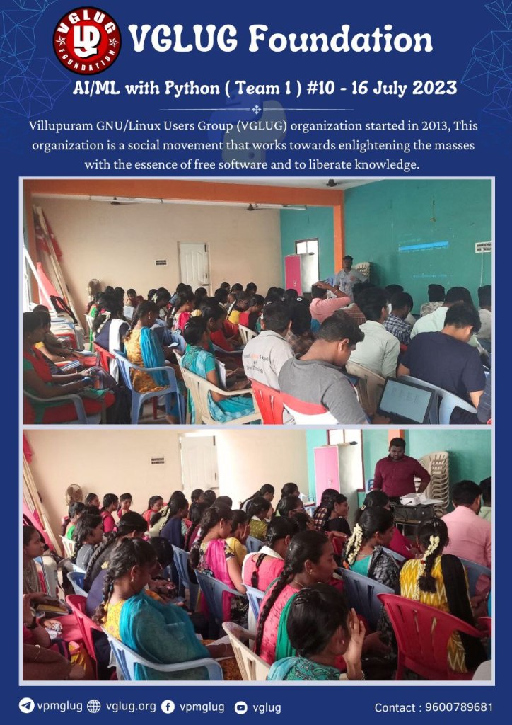 VGLUG sharing various technology knowledge to rural college students. As part of it we are doing AI/ML with Python and Cyber Security Training class every week. The training is divided into three teams due to huge number of participants. Engineering students are in AI/ML with Python Team 1, Arts & Science students are in AI/ML with Python Team 2 and overall cyber security participants are in a separate team. In this training we share knowledge about AI/ML with Python and Cyber Security , Free software technologies, tools and social activities.