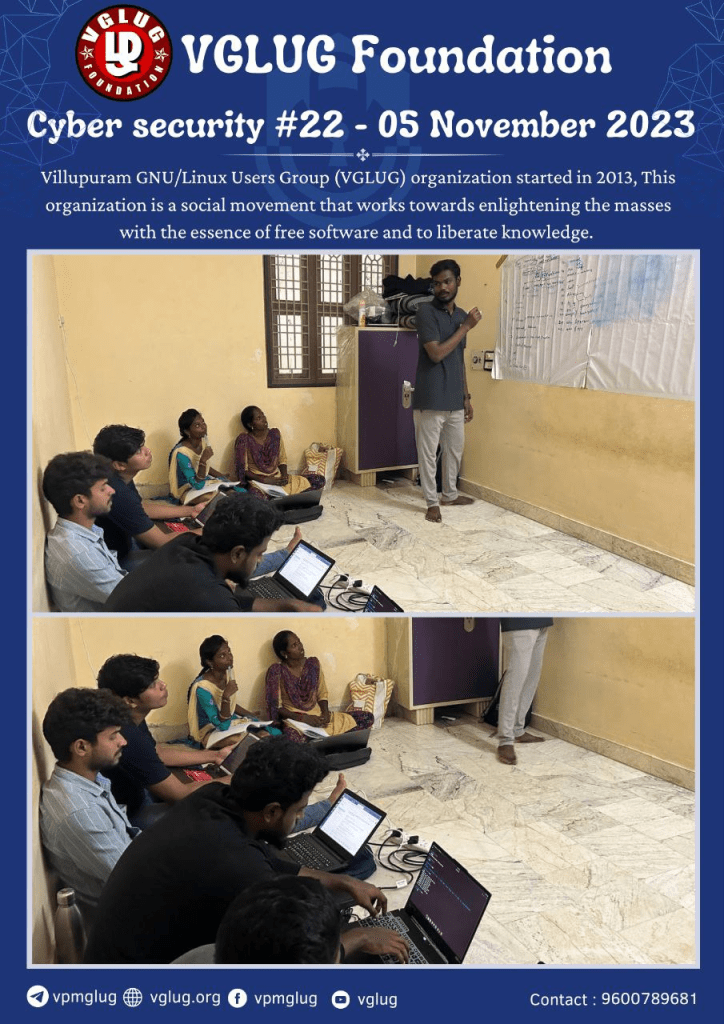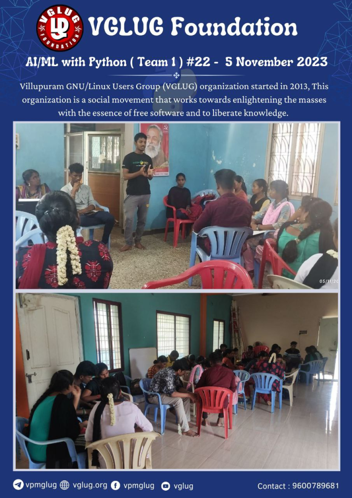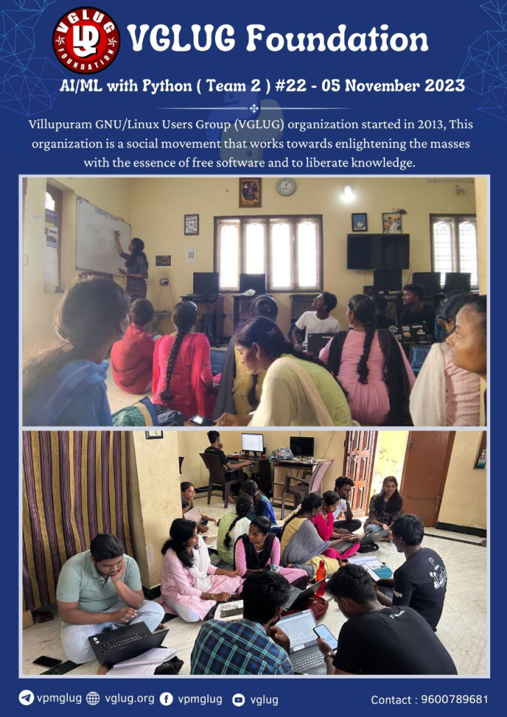 VGLUG sharing various technology knowledge to rural college students. As part of it we are doing AI/ML with Python and Cyber Security Training class every week. The training is divided into three teams due to huge number of participants. Engineering students are in AI/ML with Python Team 1, Arts & Science students are in AI/ML with Python Team 2 and overall cyber security participants are in a separate team. In this training we share knowledge about AI/ML with Python and Cyber Security , Free software technologies, tools and social activities.