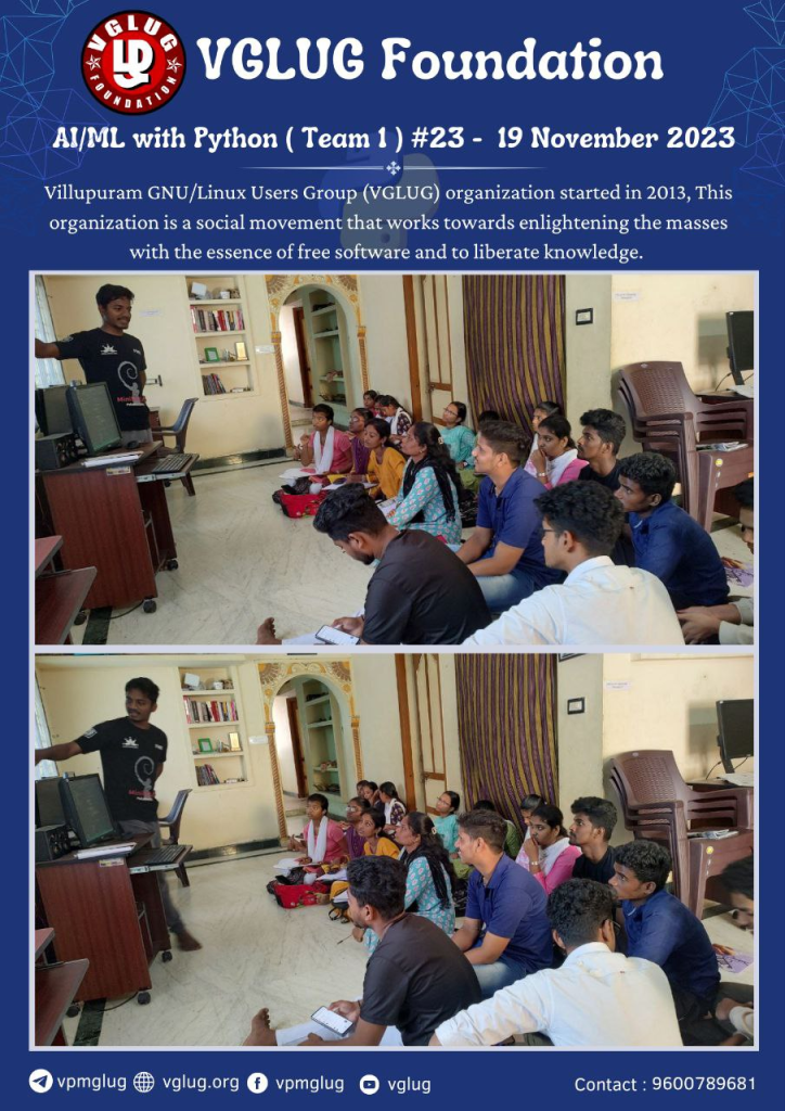 VGLUG sharing various technology knowledge to rural college students. As part of it we are doing AI/ML with Python and Cyber Security Training class every week. The training is divided into three teams due to huge number of participants. Engineering students are in AI/ML with Python Team 1, Arts & Science students are in AI/ML with Python Team 2 and overall cyber security participants are in a separate team. In this training we share knowledge about AI/ML with Python and Cyber Security , Free software technologies, tools and social activities.