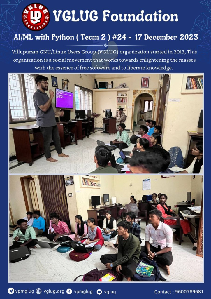 VGLUG sharing various technology knowledge to rural college students. As part of it we are doing AI/ML with Python and Cyber Security Training class every week. The training is divided into three teams due to huge number of participants. Engineering students are in AI/ML with Python Team 1, Arts & Science students are in AI/ML with Python Team 2 and overall cyber security participants are in a separate team. In this training we share knowledge about AI/ML with Python and Cyber Security , Free software technologies, tools and social activities.