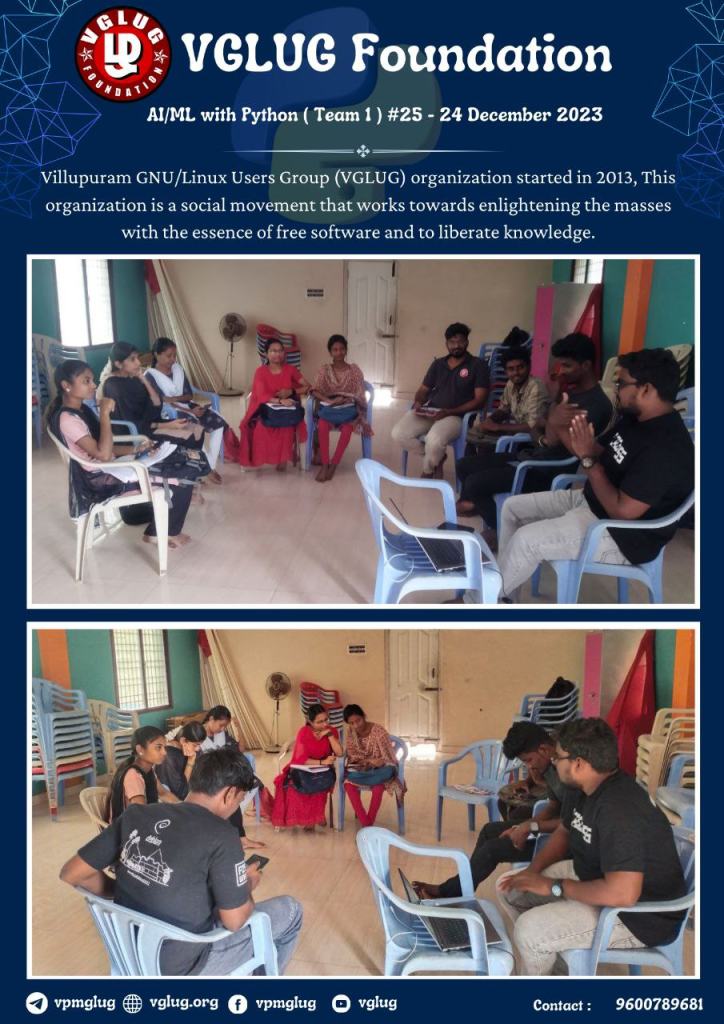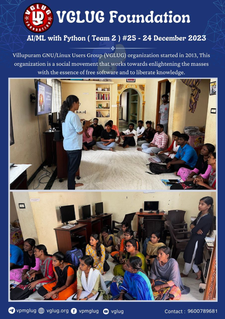 VGLUG is sharing various technology knowledge with rural college students. As part of this initiative, we conduct weekly AI/ML with Python and Cyber Security training classes. The training is divided into three teams due to a large number of participants. Engineering students are assigned to AI/ML with Python Team 1, Arts & Science students to AI/ML with Python Team 2, and overall cybersecurity participants are in a separate team. During these sessions, we share knowledge about AI/ML with Python, Cyber Security, free software technologies, tools, and social activities.